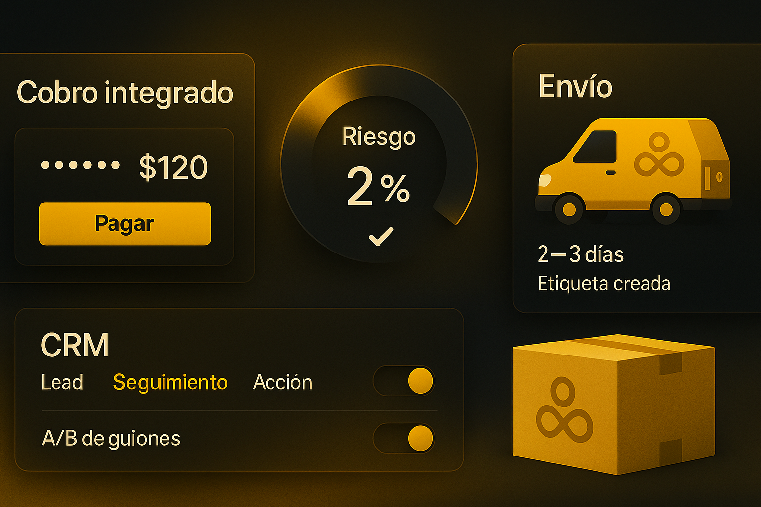 DisponibleResponde al instante, cobra por link/checkout, actualiza tu CRM y coordina envíos con trazabilidad. Menos pasos, más conversión.